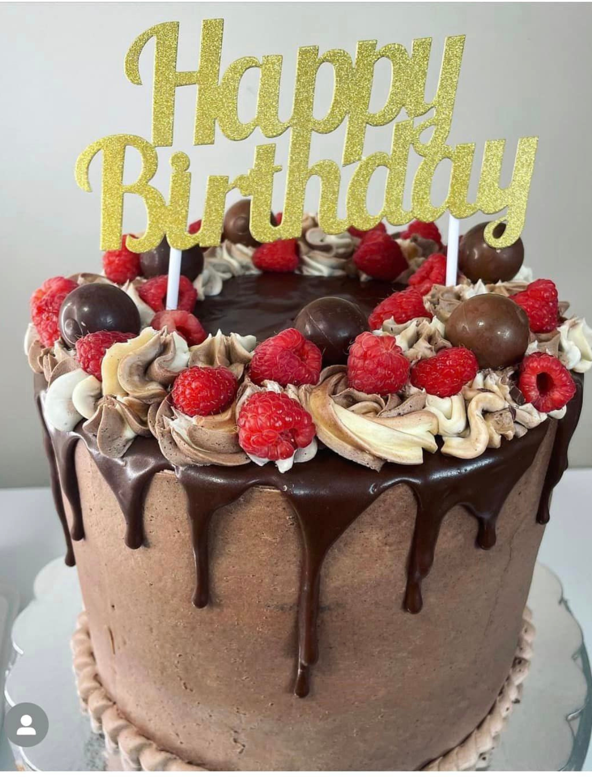 A tall style, 4 layer cake made with decadent chocolate cake featuring raspberry filling, and chocolate ganache, topped with fresh raspberries.