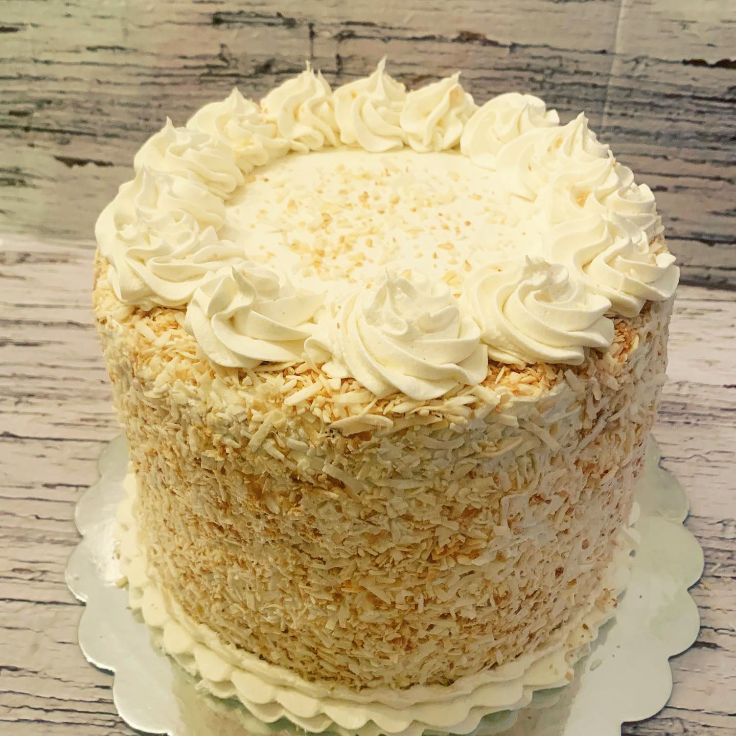 A delicious, tall style, 4-layer Coconut cake with a coconut custard filling and toasted coconut coating.